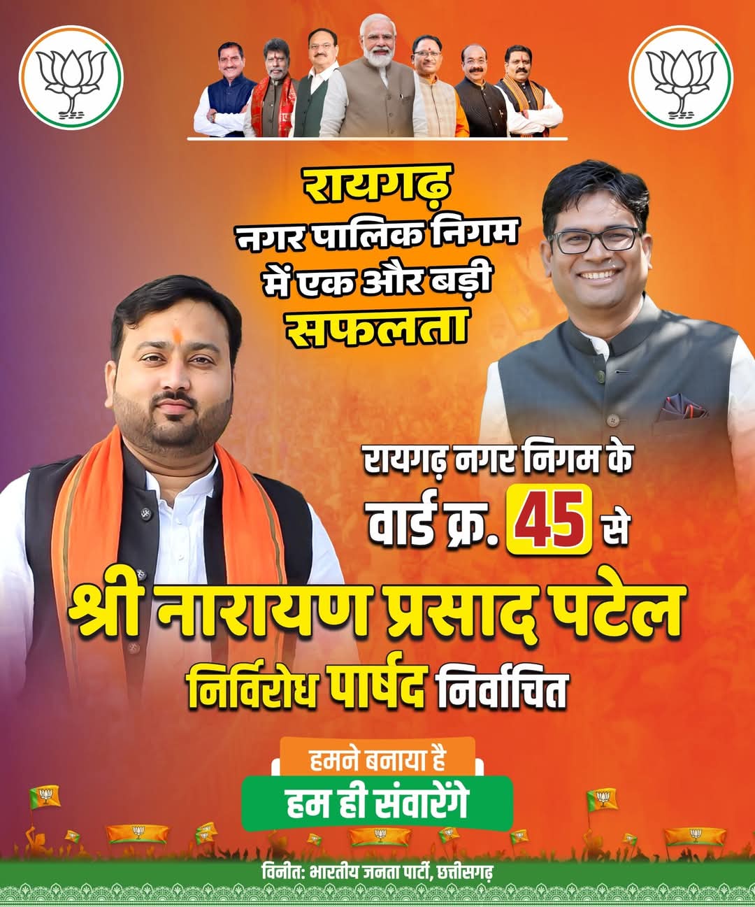 ये भी पढ़िए... रायगढ़: वार्ड नंबर 18 में बीजेपी प्रत्याशी पूनम की निर्विरोध जीत
